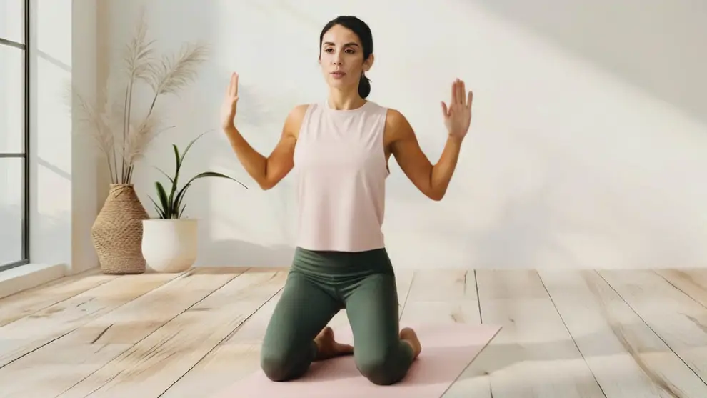 - dobla los codos y junte las palmas de las manos frente a su pecho.