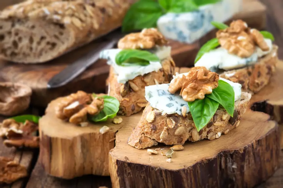 • Baguette de semillas • Queso gorgonzola o similar • Frutos secos • Albahaca lavada