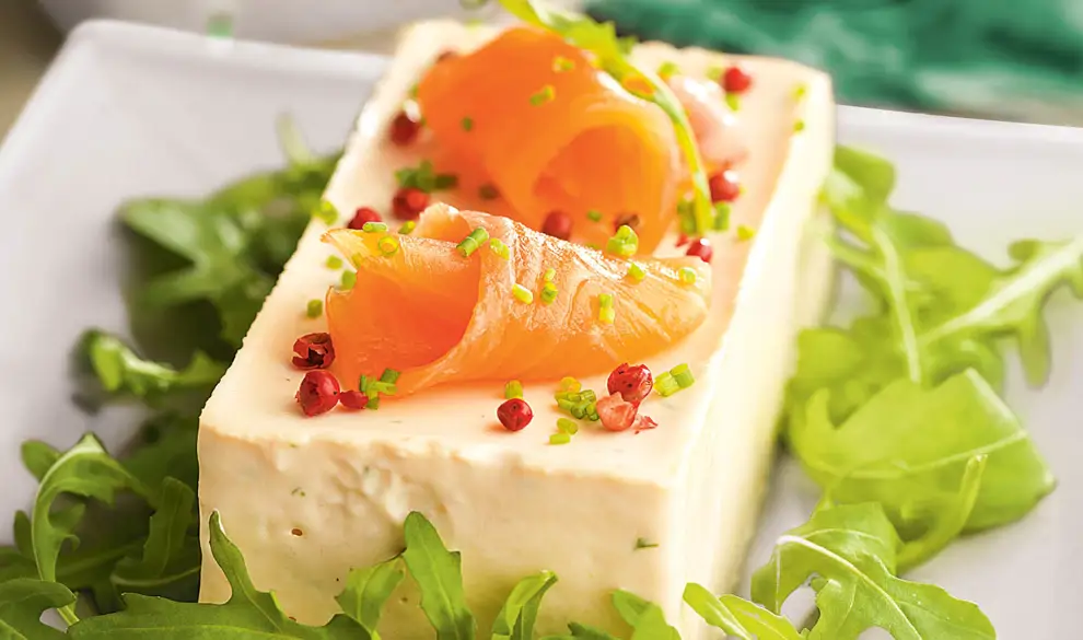 • 600 g de salmón • 2 lonchas de salmón ahumado • 2 yogures naturales • 80 g de nata ligera para cocinar • 60 g de crema de leche concentrada • ½ limón (ralladura) • 6 hojas de gelatina • Rúcula • Pimienta blanca • Pimienta rosa • Unos tallos de cebollino • Sal