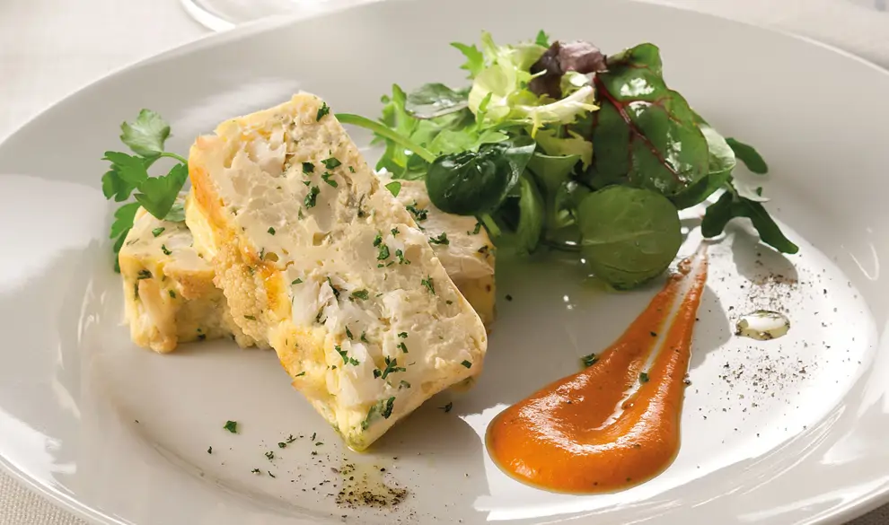 • 1 coliflor • 3 huevos • 250 g de bacalao desalado y desmenuzado • 150 ml de leche condensada • 1 cebolla • 2 dientes de ajo • ½ taza de perejil picado • 1 cucharadita de mantequilla • 1 cucharadita de harina • Aceite de oliva • Pimienta • Sal