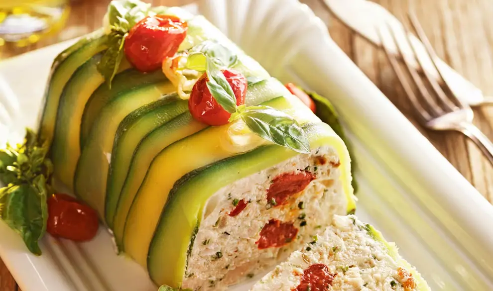- Forrar un molde con film y cubrir el fondo y los lados con el calabacín. Agrega la preparación anterior con los tomates asados, coloca un peso encima y refrigera por unas 12 horas antes de desmoldar.