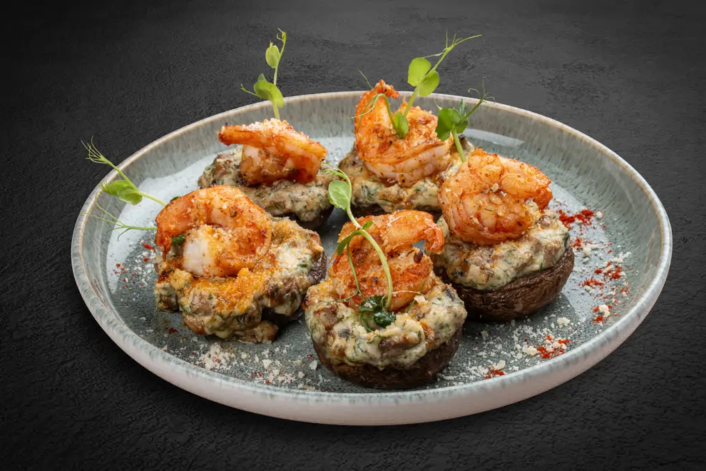 La mezcla de camarones y champiñones ofrece pProteína magra, yodo, omega-3 y minerales. Es un plato ligero y marino, perfecto como entrante o tapa caliente.