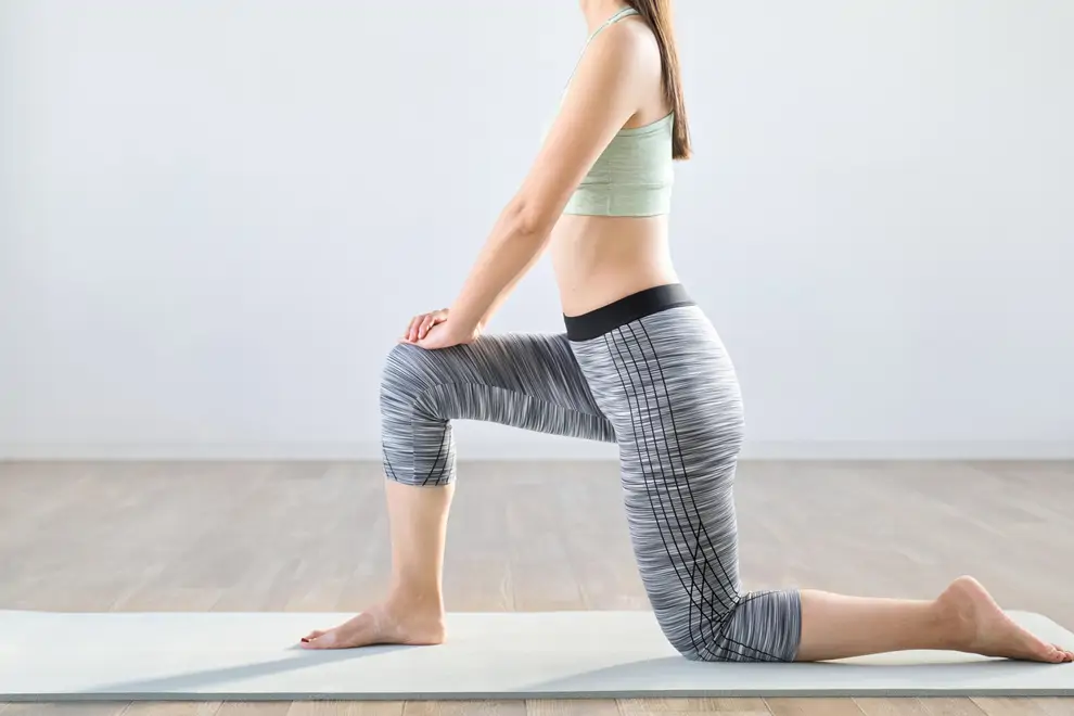 - Desliza la otra pierna hacia atrás hasta que sientas el estiramiento en la parte delantera del muslo y la cadera.