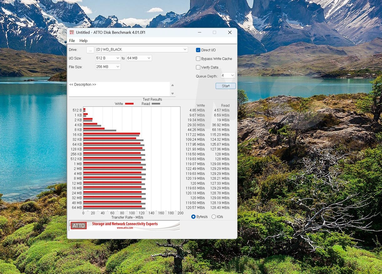 Para comparar cifras de rendimiento, también probé la unidad para juegos WD_BLACK P10 de 6 TB con la herramienta ATTO y Los resultados están dentro de las expectativas.el valor de lectura secuencial está cerca de 130 MB/s y el valor de escritura secuencial está cerca de 120 MB/s. Puedes hacer clic en la imagen para ampliarla y ver mejor los resultados de cada subprueba.