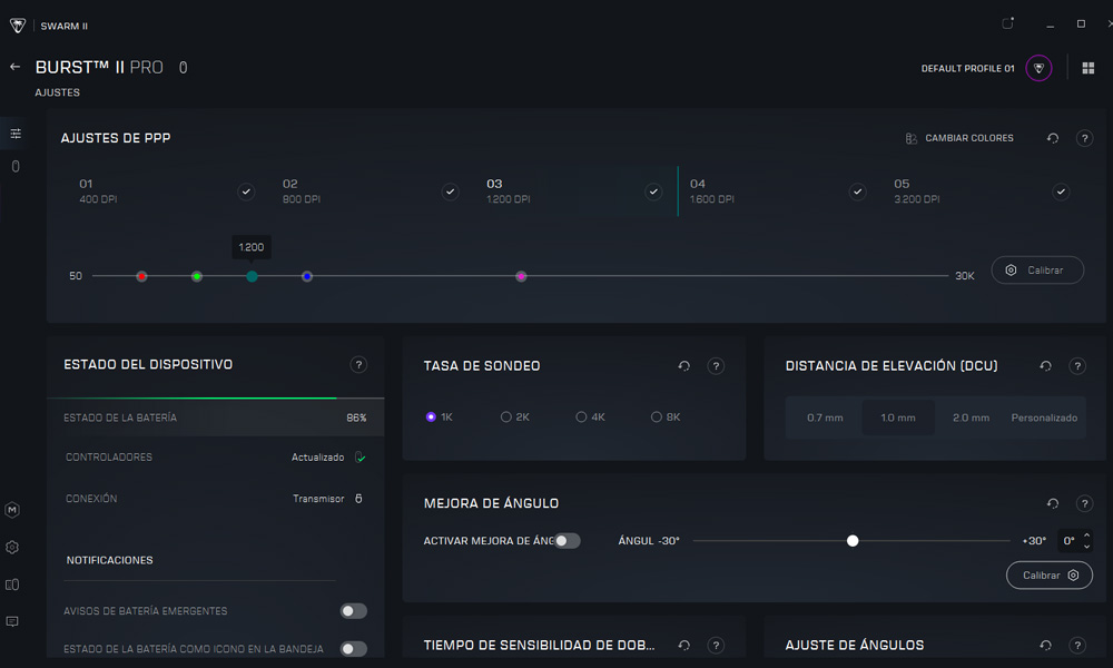 Desde el panel de Burst II Pro podremos ajustar la tasa de sondeo hasta 8K, elegir entre máxima fluidez para competición o ahorro de energía para la oficina, y configurar al detalle el nivel de DPI y la distancia de aumento (Distancia de despegue), especialmente útil para quienes trabajan en diseño y necesitan que el cursor no salte al reposicionar el mouse.
