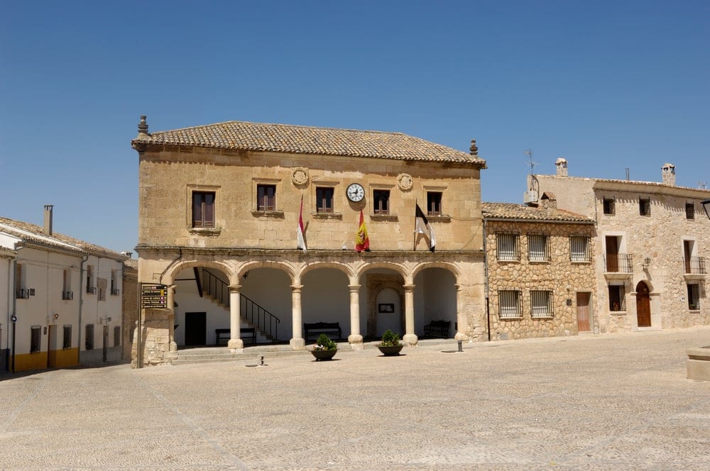 En el otro extremo de Alarcón encontramos el Iglesia de la Santísima Trinidad Originaria también del siglo XIII, pero modificada en siglos posteriores con altar renacentista y portada plateresca. Como plateresco, es otra de las joyas más populares de Alarcón: la fachada sur del Iglesia de Santa Maríadiseñado por Esteban Jamete de Orleans que vino a trabajar a Toledo, Valladolid y Úbeda, entre otras ciudades.