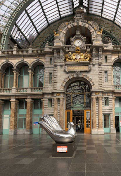 Un buen punto de partida para este recorrido es la estación de tren de Amberes en el centro. El vestíbulo de este majestuoso edificio está dominado desde 2018 por la obra del artista chino Yan Shufen, mano de pazque juega con la perspectiva para engañar al espectador con esta gran escultura cromada que a veces recuerda a una mano, a veces a una paloma. Antes de abandonar la estación, el viajero debe saber que acaba de llegar ante una de las joyas arquitectónicas que ilustra el renacimiento estilístico flamenco del siglo XIX.