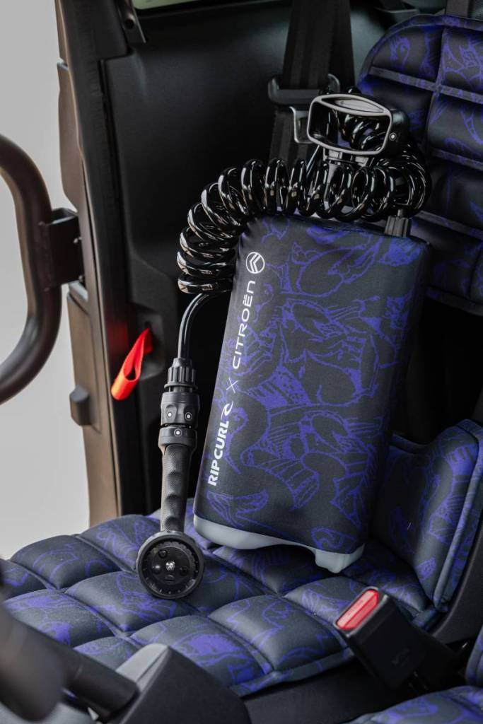 Colaboración con Rip Curl No se limita a la estética. El concepto incluye accesorios creados para quienes viven entre las olas: estera de neopreno recicladoA ducha portátilA bolsa impermeable y un riñonera que se fija al volante.