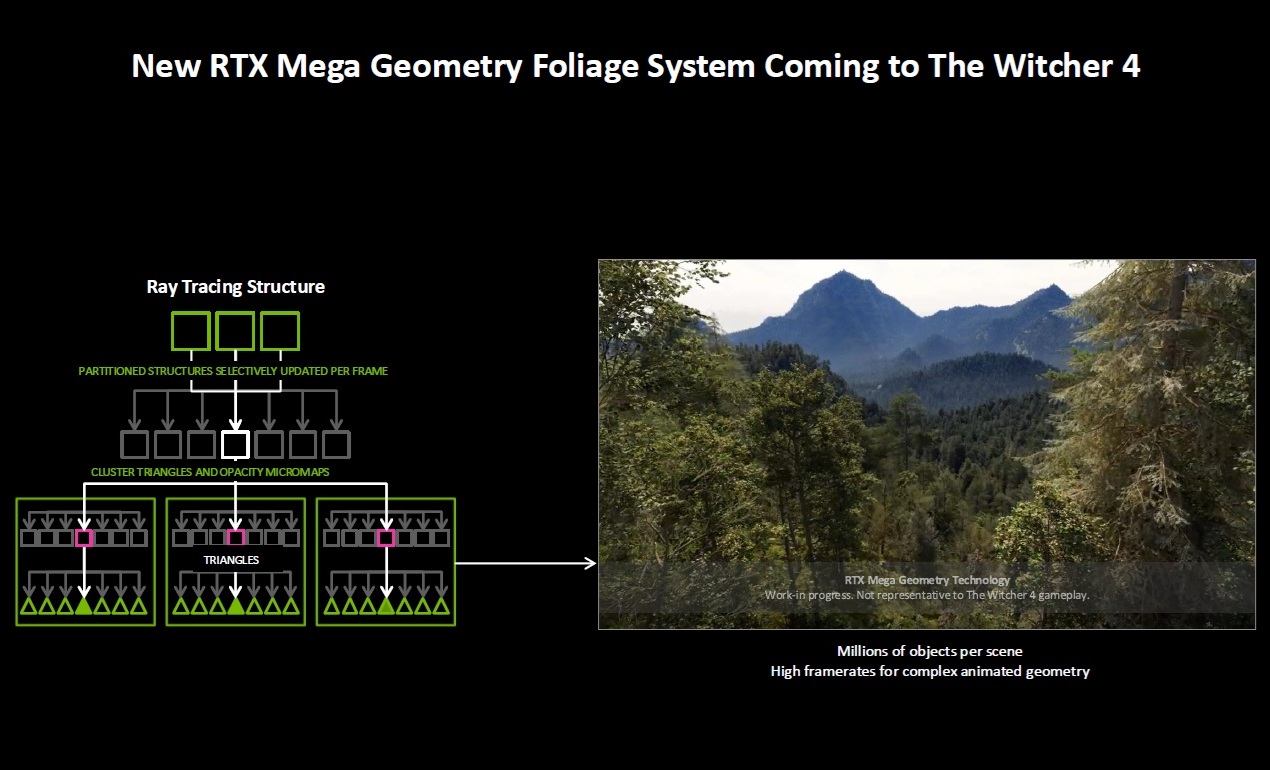 Esta tecnología aparecerá en The Witcher IV y permitirá animar perfectamente millones de objetos por escena con una alta densidad geométrica sin afectar negativamente al rendimiento. ¿En qué se traduce esto? Vegetación más realista, rica y detallada y un nivel de modelado 3D casi fotorrealista.