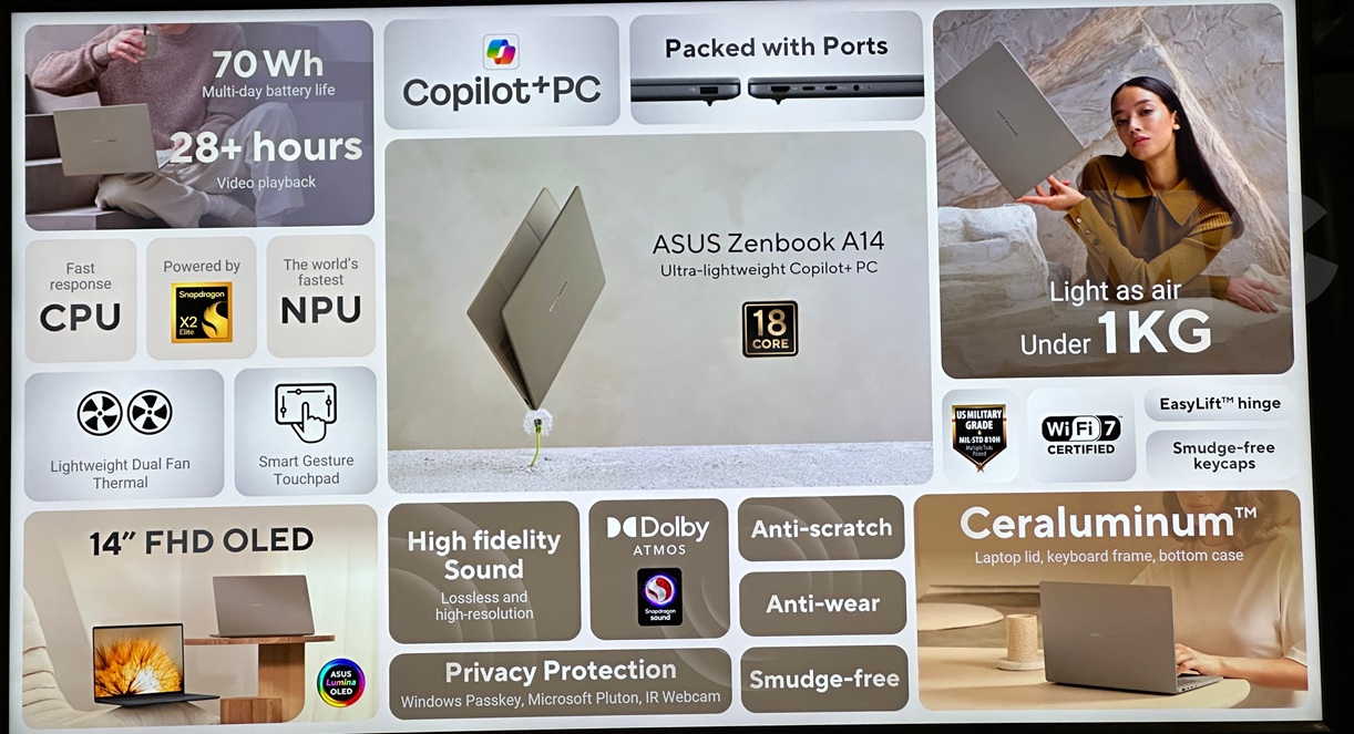 La serie Zenbook A se dividirá en dos modelos: A14 y A16. El primero tendrá un pantalla de 14 pulgadas y un peso menos de 1 kglo que significa que se convertirá en un modelo estrella para quienes priorizan la movilidad y necesitan un dispositivo muy ligero y cómodo para transportar. El segundo tendrá una pantalla de 16 pulgadas y ofrecerá Un mejor equilibrio entre movilidad y productividad.