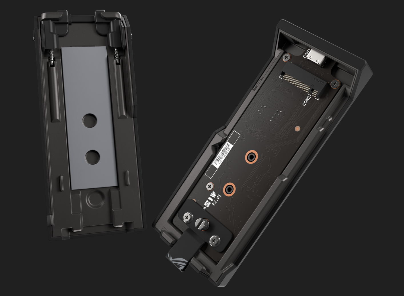 En cuanto al nivel de detalle de este caso, hay que mencionar Iluminación Aura RGB personalizable Estos incluyen permitir a los usuarios personalizar el almacenamiento portátil con imágenes dinámicas a través de una interfaz web intuitiva. Para mayor movilidad, la vivienda incluye un gancho metálico con uno etiqueta de telalo que facilita su fijación, almacenamiento y transporte. como una cereza encima Fácil monitoreo, el chasis utiliza el tablero exclusivo ROG SSD, Interfaz de usuario personalizada Proporcionar a los usuarios Descripción general completa del estado en tiempo realrendimiento y otros indicadores de conducción clave.