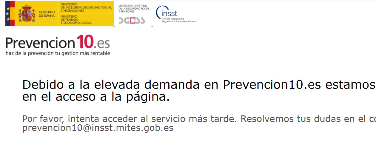 Debido a la gran demanda en Prevention10.es estamos teniendo problemas para acceder a la página. Intente acceder al servicio más tarde. Resolvemos tus dudas por correo electrónico: prevencion10@insst.mites.gob.es