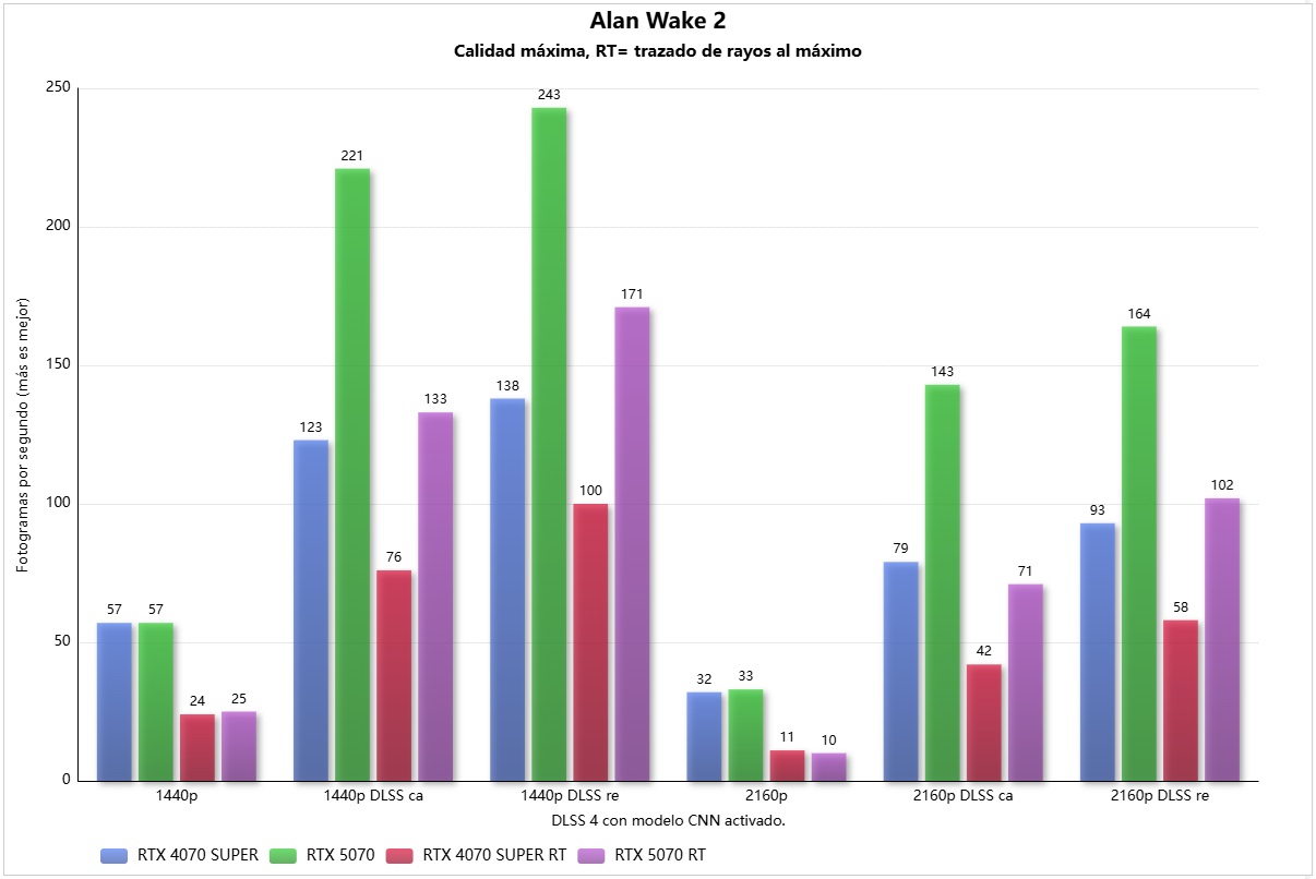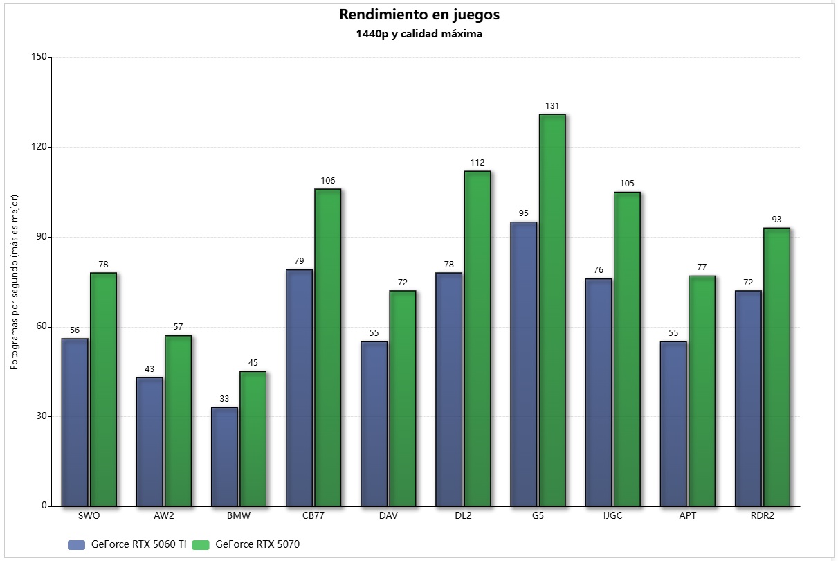 La GeForce RTX 5070 se defiende bastante bien en esta resolución, y es una de las mejores compras si tenemos un presupuesto ajustado, pero lo ideal sería invertir un poco más e irnos a por una GeForce RTX 5070 Ti o una Radeon RX 9070 XT.