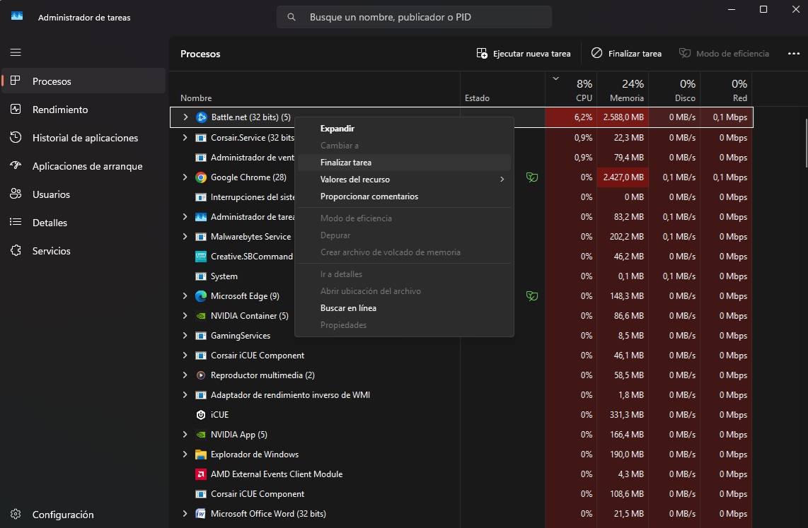 • Para cerrar un proceso o aplicación, haga clic derecho en él y seleccione Finalizar tarea.