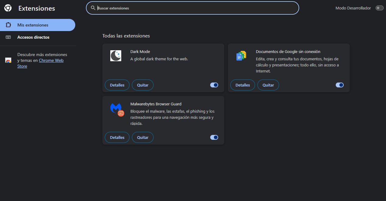 Otra forma de reducir el consumo de RAM en Windows 11 es Eliminar la extensión de nuestro navegador. Los pasos dependen del navegador que utilicemos, pero suelen ser muy similares. Si usas Chrome te dejo el proceso a seguir: