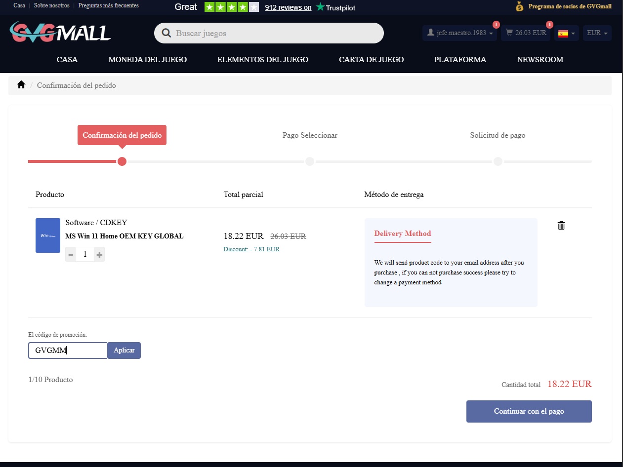 - Windows 10 Home Edition OEM es válido de por vida 12,6€, Utilice el cupón GVGMM antes de completar el proceso de compra.