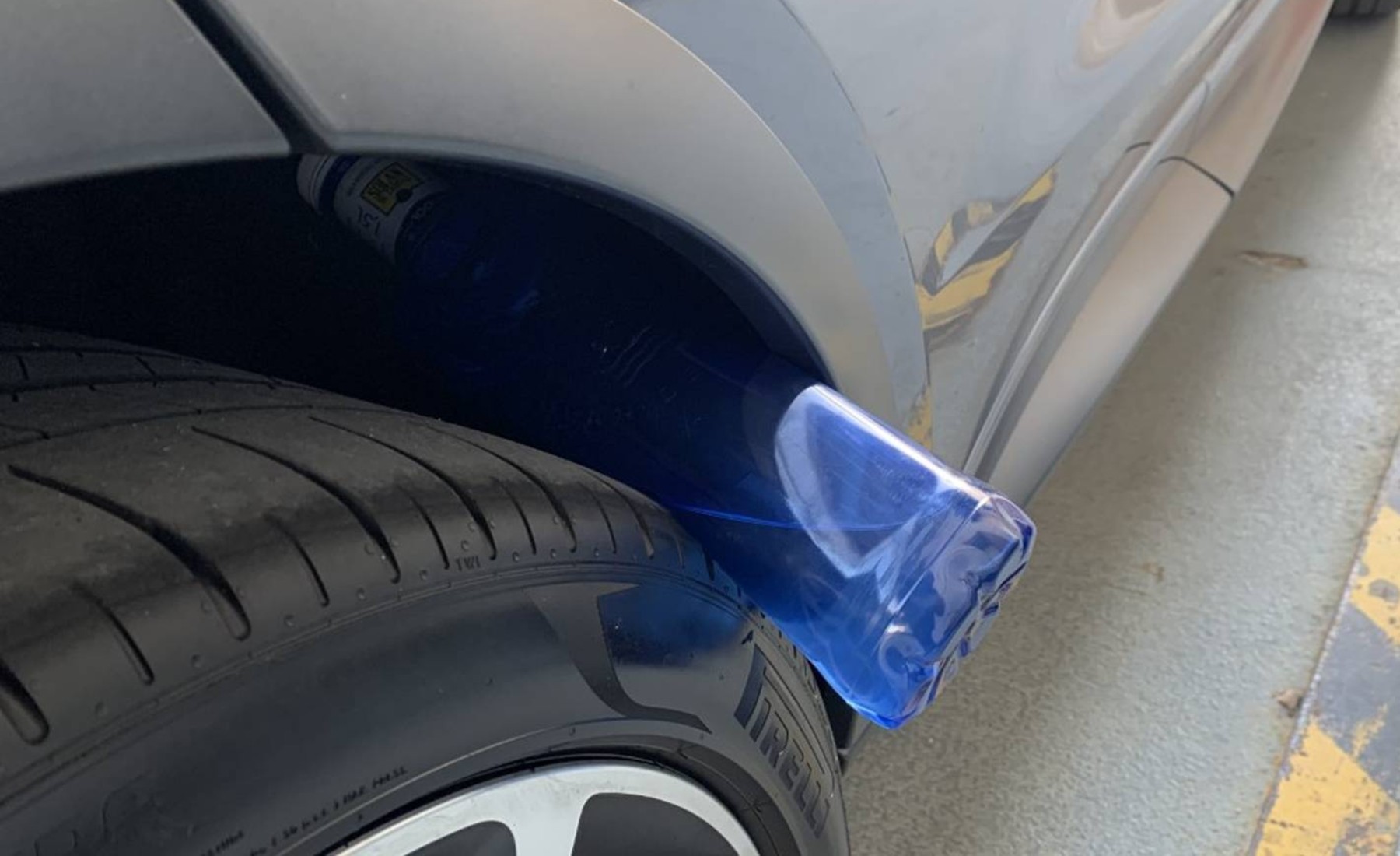 De esta manera es más difícil de notar para el conductor que hay un objeto en la rueda, estando ubicado en el lado opuesto al acceso al vehículo. Una vez iniciada la marcha, la botella hace el suficiente ruido suficiente para que el conductor se detenga y detecte el problema.