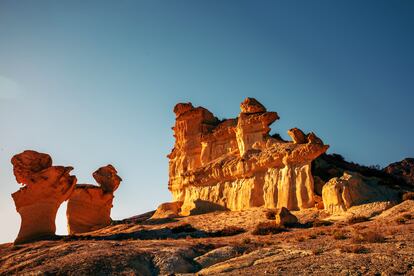 Mazarrón y el pequeño pueblo de pescadores de Bolnuevo tienen muchos lugares curiosos. Por un lado, es un buen lugar para avistar delfines o cachalotes. Por otro, pesa su tradición minera. Pero, sobre todo, es conocido por su espacio natural conocido como las erosiones o gredas de Bolnuevo, una especie de miniciudad de piedra, que fue declarada monumento natural en 2019 y son un relieve natural en plena transformación por la erosión constante y por la naturaleza de sus materiales: margas arenosas y areniscas. Es fácil localizarlas, ya que se encuentran a pie de la playa de Bolnuevo.