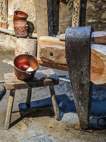 Une forge vulcaine avec un marteau de forge géant, que même le dieu lui-même, avec l’aide de Thor, ne pouvait manier. C’est ce que l’on découvre à Navafría (kilomètre 162 de la N-110) : un marteau-piqueur ou maillet pour battre le cuivre avec une tête en fer de 280 kilos et le tronc d’un pin sylvestre adulte comme manche qui peut frapper le métal chaud jusqu’à 200 fois par minute, entraîné par une grande roue hydraulique comme celle d’un bateau à vapeur du Mississippi, qui est à son tour déplacée par les eaux de la Cega, une rivière qui abrite des truites au lieu d’alligators. Et elle produisit des pots en cuivre jusqu’à la mort de Victoriano Abán, le dernier à les fabriquer en Europe, en 1997. Mais le marteau est conservé en parfait état et est montré pour cinq euros à ceux qui appellent à l’avance à l’Office de Tourisme de Navafría.