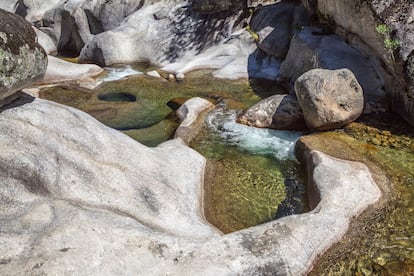 En été, la Garganta de los Infernos a peu de choses infernales. Dans la zone de Los Pilones, l’eau tumultueuse a sculpté d’immenses piscines dans le granit, aux formes et aux polis fantastiques, qui s’enchaînent sur 200 mètres, formant un toboggan le long duquel glissent des multitudes de baigneurs comme s’il s’agissait d’un parc aquatique quand il fait chaud. En automne et en hiver, lorsque les gorges sont pleines d’eau, cela ressemble à un enfer, avec les bouilloires géantes – c’est ainsi que les géologues appellent les piscines – qui bouillonnent bruyamment. Il y a un centre d’interprétation à mi-chemin entre Jerte et Cabezuela del Valle, au kilomètre 368 de la N-110, où commence un sentier balisé qui entre dans la réserve naturelle de la Garganta de los Infiernos et mène en une heure à Los Pilones, l’enfer hivernal de la vallée de Jerte. Le stationnement au point de départ est payant en été. Pas maintenant.