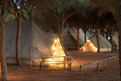 Los recorridos parten desde sus instalaciones, ubicadas junto al cámping Doñana, un clásico. Es enorme y dispone de todo tipo de alojamiento: desde plazas para acampar o aparcar la caravana hasta barracones, pasando por distintos tipos de cabañas o casas prefabricadas. el área de glampinggestionado por Kampaoh, y donde hay tiendas de campaña de hasta 24 metros cuadrados con capacidad para seis personas y el lujo de un hotel: toalla, vajilla, kit de limpieza o incluso una nevera. En invierno también hay edredones y calentadores. Ofrecen un descanso más cercano a la naturaleza, al abrigo de los pinos en cuyas ramas revolotean las urracas. Más que suficiente para servir como sede y punto de partida para explorar un entorno alejado del cemento y el hormigón, pero con las facilidades que ofrece un lugar con multitud de instalaciones de ocio y acceso directo a la playa, de fácil acceso a pie.