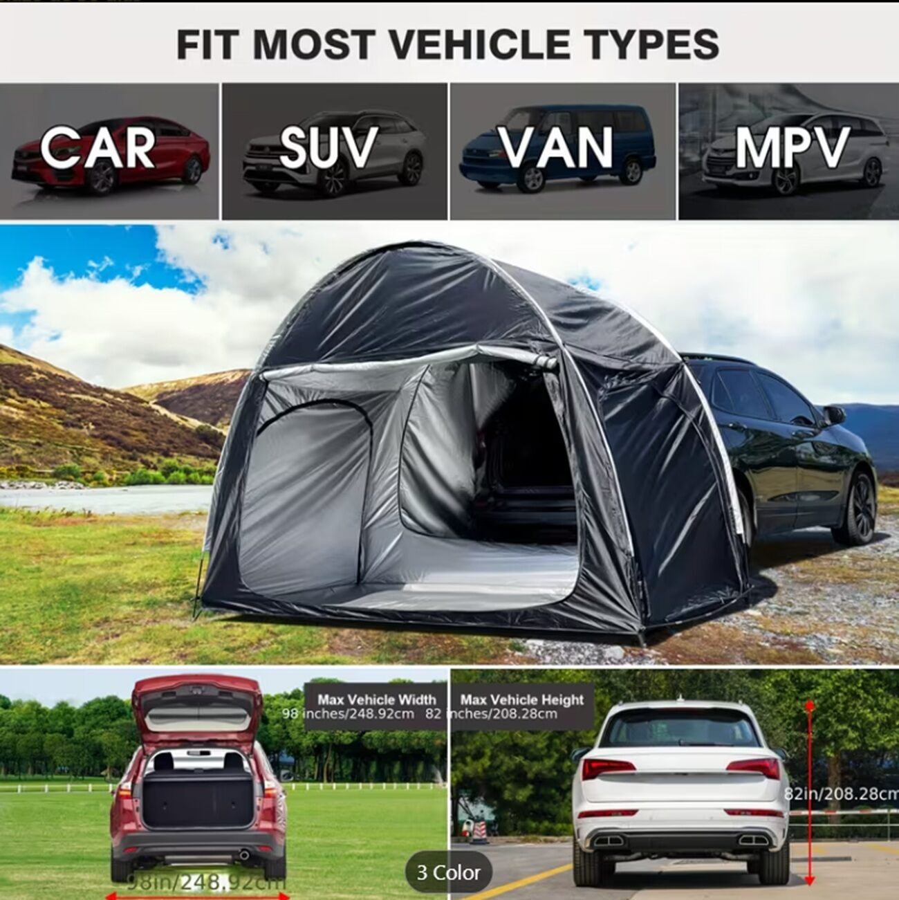 Otra opción más elegante y un poco más cara. es un tienda de campaña para coche (hay varios tamaños) confeccionados con una tela resistente con filtro UV. El de la imagen corresponde a un diseñado para SUV. El precio esta entre 70 y 80 eurosdependiendo del color y otros detalles. Tiene una valoración de 4,6 sobre cinco estrellas.