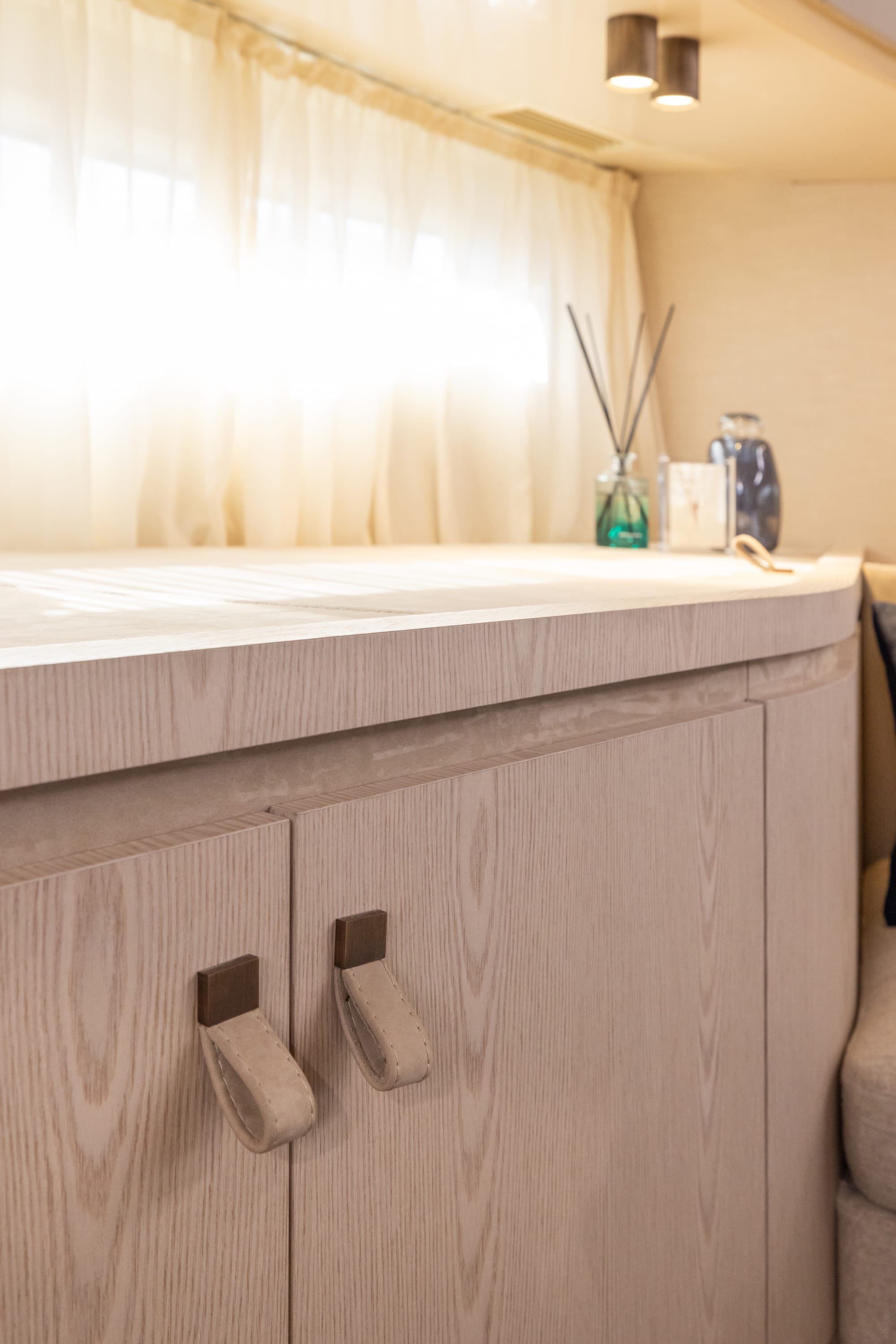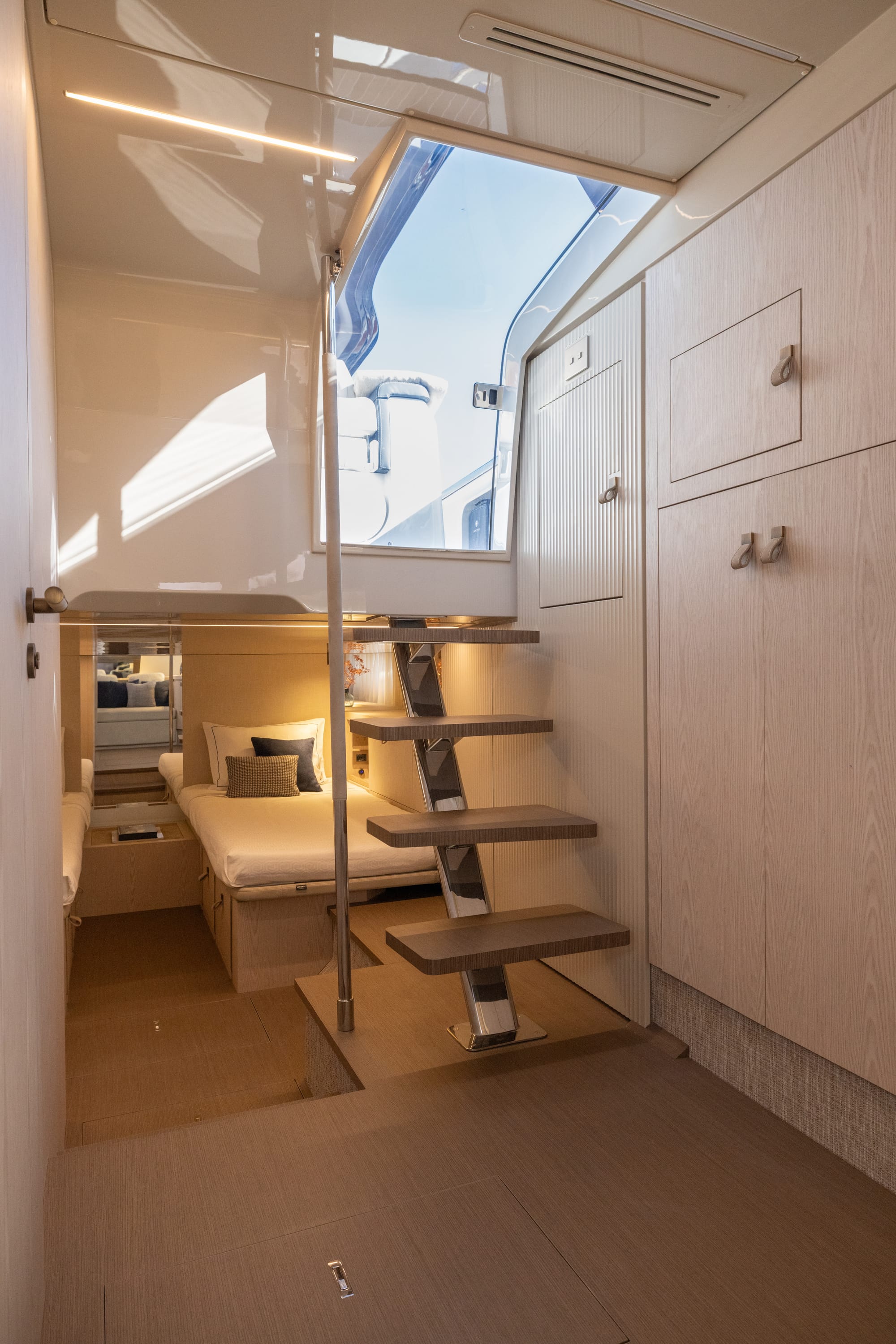 El interior cuenta una historia de Formas fluidas, colores naturales y texturas sensoriales.. La tecnología se integra discretamente, mientras que la iluminación cuidadosamente calibrada acentúa una atmósfera de bienestar. La paleta de colores (arena, agua, piedra) refuerza el vínculo entre el barco, el paisaje y la naturaleza.