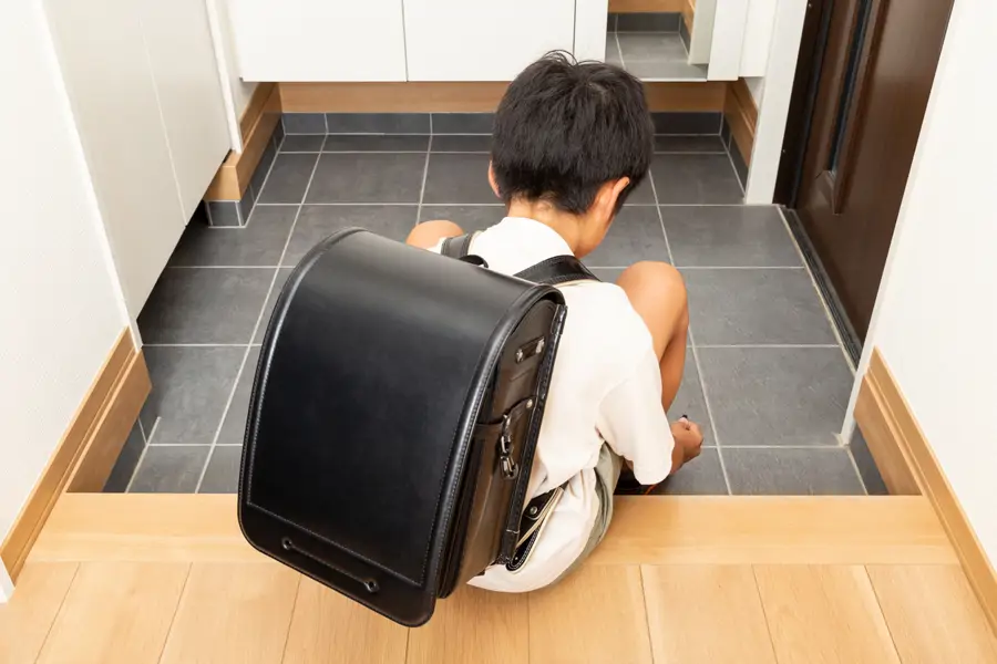 Niño poniendo zapatos en el Genkan.