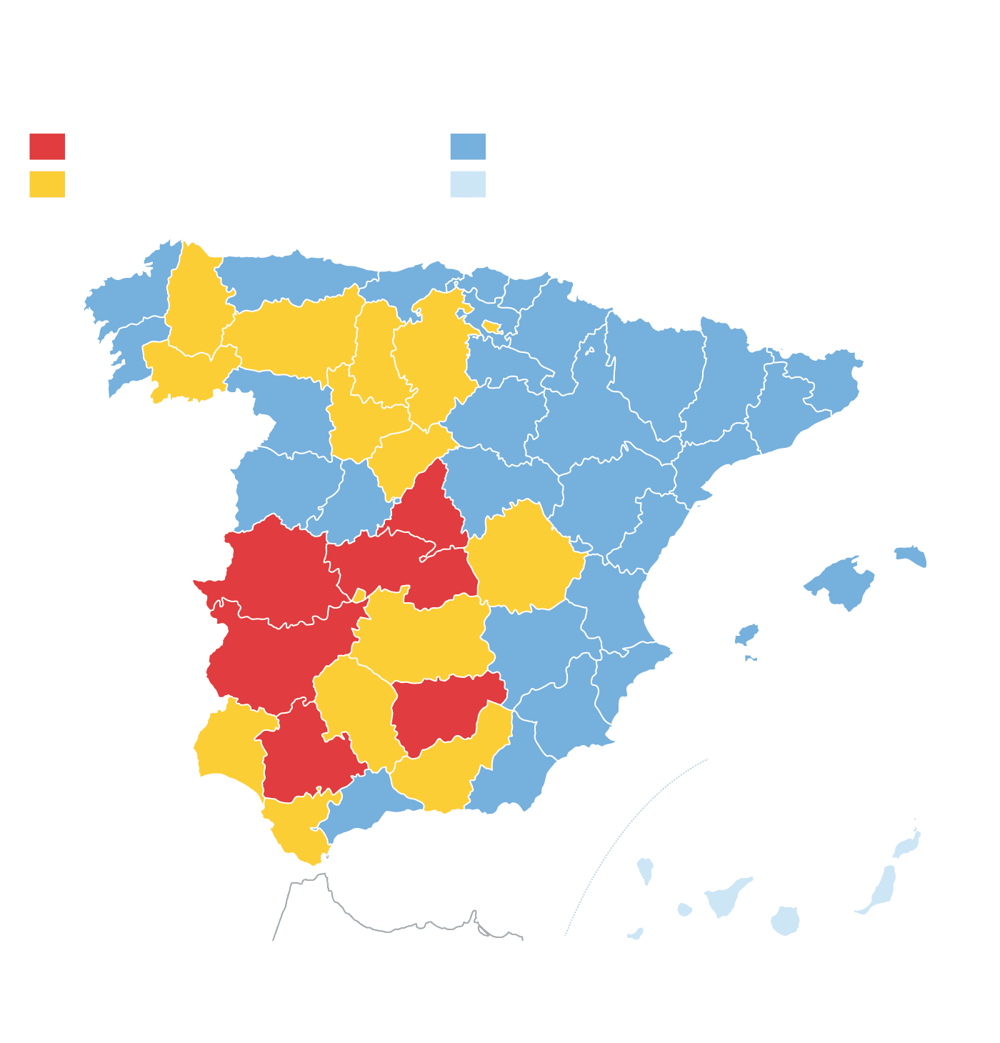 En Canarias, en cambio, se esperan cifras muy bajas, con concentraciones aproximadas entre 250 y 500 granos/m³ en Tenerife y Las Palmas. En Galicia los niveles oscilarán entre ligeros y moderados, especialmente en Orense y Lugo.