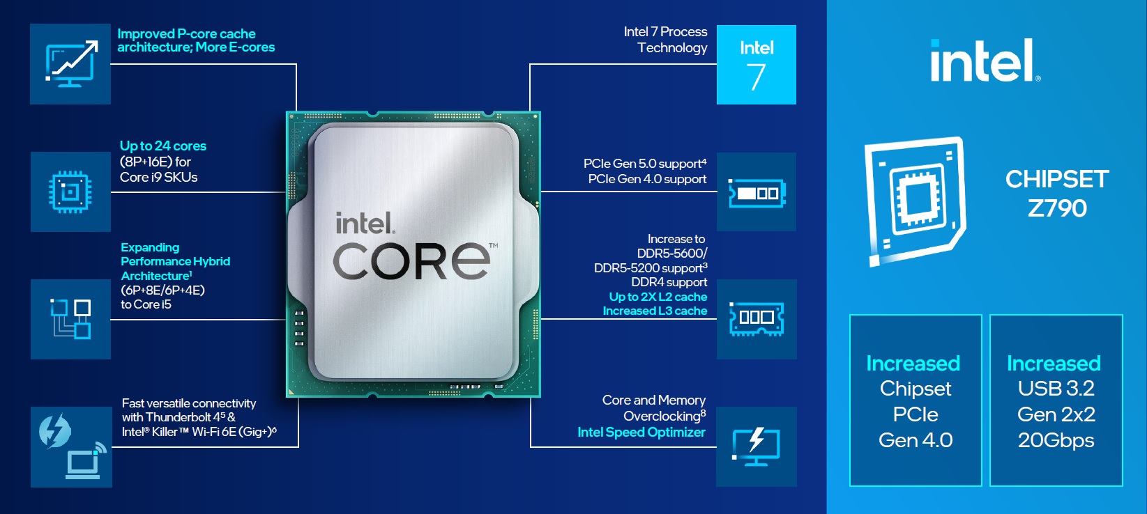 Los procesadores Raptor Lake-S mantienen la base híbrida de Alder Lake-S, lo que significa que tienen dos bloques de núcleos, uno con hasta 8 núcleos de alto rendimiento y otro con hasta 16 núcleos de alta eficiencia. El primer bloque se basa en la arquitectura Raptor Cove, que mejora el rendimiento monohilo hasta en un 15% frente a Golden Cove, y el segundo repite la arquitectura Gracemont, pero al contar con el doble de núcleos de alta eficiencia se mejora el rendimiento multihilo hasta en un 41%. Están fabricados en el nodo Intel 7 (10 nm).