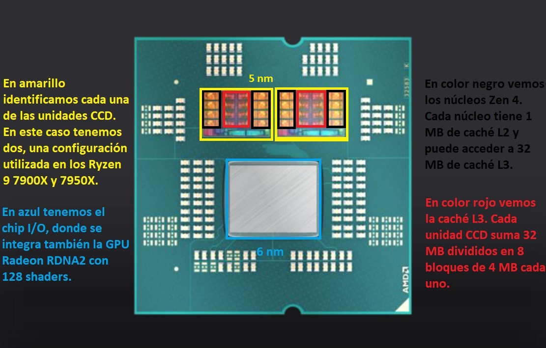 AMD también repitió la base que vimos en Zen 3, lo que significa que los procesadores Ryzen 7000, basados en Zen 4, mantienen la unidad CCD de 8 núcleos y 32 MB de caché L3 como base, y utiliza dos de esas unidades para crear procesadores de hasta 16 núcleos y 32 hilos. Según AMD esta generación mejora el IPC hasta en un 13% frente a Zen 3, y ha sido capaz de superar la barrera de los 5 GHz de frecuencia. Están fabricados en el nodo de 5 nm.