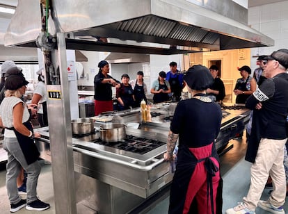 La recuperación de una receta tradicional —L’arròs de Castelldefels— convertida en una experiencia enogastronómica completa, desde la huerta del Baix Llobregat hasta las cocinas de la Escuela de Hostelería de esta localidad barcelonesa, es una de las dos actividades galardonadas. Pero más que un taller culinario, se trata de “que la persona que venga a hacer la experiencia haga una inmersión completa en el territorio”, afirma Raimon Martínez, director de la escuela. De hecho, la actividad (cinco horas; 90 euros por persona; grupos de hasta 20 personas) comienza lejos de los fogones: divididos en dos grupos, los participantes visitan a su elección el Parque Agrario del Baix Llobregat o la Lonja de Vilanova i la Geltrú, donde conocen el origen de los ingredientes que van a cocinar. “Vamos con ellos a hacer la recogida de las alcachofas”, explica Martínez, dialogando con los productores locales, “y vamos a la lonja para ver cómo se hace la recogida de la gamba, de dónde sale el producto”.