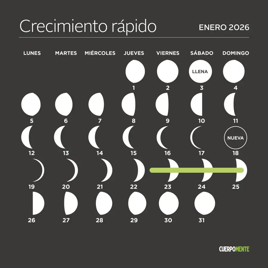 Él jueves 18 de enero La Luna pondrá los toques finales al ciclo lunar con el que marcaremos nuestros propósitos de Año Nuevo y entraremos fase de luna nueva. Volverá a crecer para finalizar el mes superando su primer trimestre. La fase de distrito de la media lunaen el que la Luna vuelve a estar exactamente medio iluminada, el lunes 26 de enero.