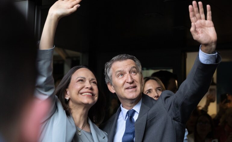 Por su parte, Feijóo pidió este viernes que el líder de la oposición puede volver a Venezuela y que haya elecciones libres en el país. «Exigimos primero que María Corina pueda regresar a Venezuela y segundo que se realicen elecciones libres con un calendario explícito y lo más pronto posible», afirmó en su discurso.