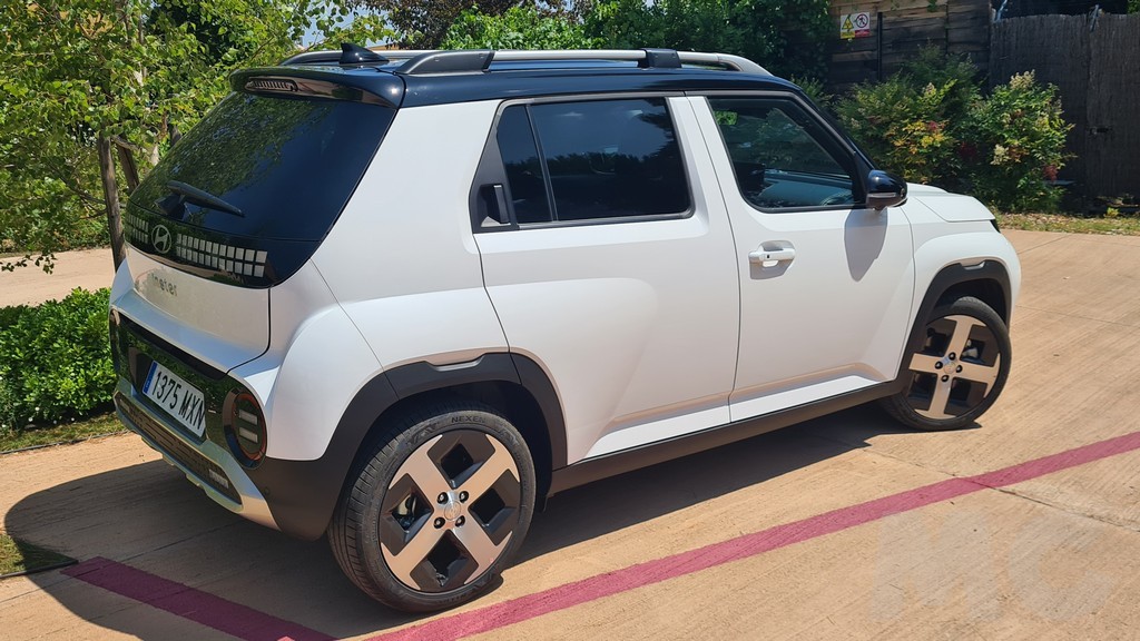 Es en la vista lateral donde se aprecia la singularidad de las proporciones del Inster. La batalla extendida empuja las ruedas hacia los extremos absolutos de la carrocería reduciendo los voladizos delantero y trasero a la mínima expresión. Esto no solo mejora la habitabilidad sino que le da una postura muy asentada sobre el asfalto. La altura de la carrocería (1.575 mm) y las barras de techo (de serie en acabados altos y versión Cross) contribuyen a esa silueta de micro-todoterreno que lo coloca estéticamente en el ámbito de los micro-SUV.