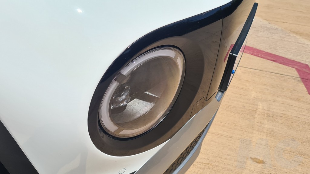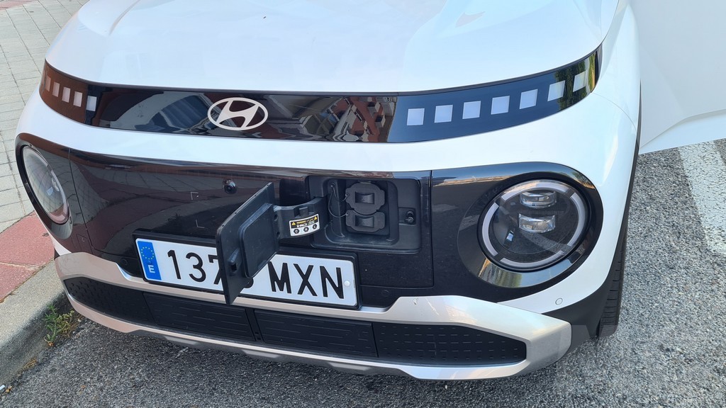 En la parte superior, justo en la línea del capó encontramos la conexión visual con la gama IONIQ: los intermitentes y luces de posición con diseño de píxeles paramétricos. Esta banda horizontal no solo aporta un aire de tecnología y modernidad sino que ensancha visualmente el coche que es objetivamente muy estrecho (1,61 metros). La ausencia de una parrilla de radiador tradicional, sustituida por un panel carenado, mejora la eficiencia aerodinámica. El puerto de carga se encuentra situado en el frontal, ligeramente desplazado, una posición práctica para la mayoría de los puntos de carga públicos aunque por otro lado expuesta a pequeños golpes de aparcamiento.