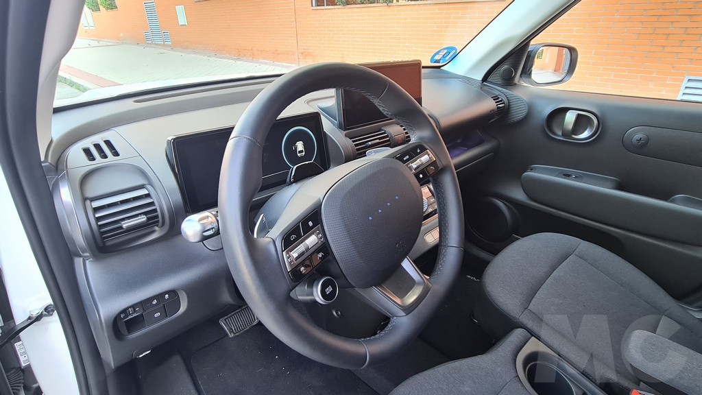 Al acceder al interior del Inster, la sensación no es la de estar en un vehículo básico sino en un producto bien pensado y ejecutado con soluciones prácticas aunque austeras. Si bien es cierto que la totalidad de los plásticos del salpicadero y puertas son duros, algo inevitable en este segmento para contener costes y peso, Hyundai ha trabajado las texturas y los acabados para ofrecer una buena percepción visual y táctil, un poco al estilo de Citröen. En el acabado Tecno encontramos materiales sostenibles como el PET reciclado de botellas y biopolipropileno en diversas superficies, alineándose con el mensaje ecológico del coche.