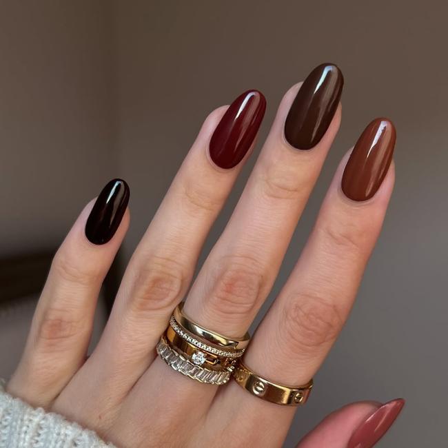 marrones. Los tonos marrones, desde el chocolate intenso hasta el caramelo, aportan calidez y elegancia. Favorecen todos los tonos de piel y combinan con la mayoría de la ropa de otoño e invierno. Además, son una alternativa más suave que el negro o el burdeos y dan un aspecto natural pero pulido. Tengo que admitir que son mis favoritos.
