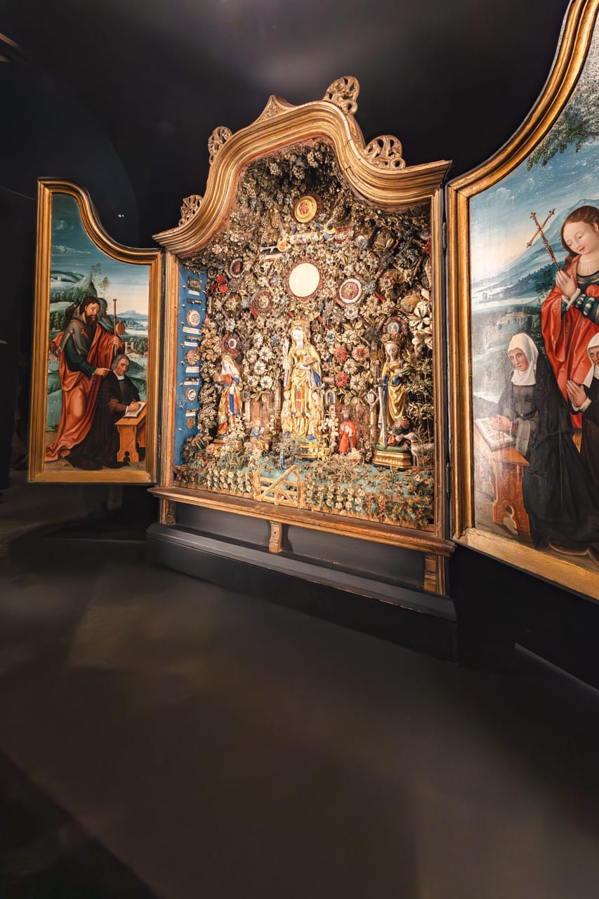 Las exposiciones exploran la vida en la ciudad en los siglos XV y XVI, el apogeo de Borgoña y el florecimiento del Renacimiento. Entre las joyas más cautivadoras del museo se encuentran “Jardines amurallados” (Besloten Hofjes)relicarios tridimensionales del siglo XVI creados por el Hermanas Hospitalarias. Estas piezas combinan esculturas de madera, flores de seda, bordados, relicarios y textos devocionales en pequeños ventanales que evocan un jardín amurallado, símbolo de pureza y contemplación. La colección del museo, una de las más importantes del mundo, ha sido reconocida como herencia flamenca.
