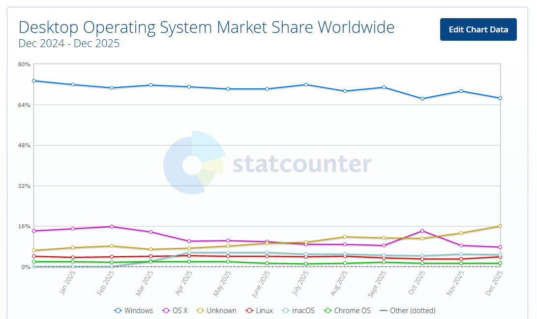 Lo peor para Microsoft es que otra parte de los usuarios está cambiando de plataforma, ya sea macOS, ChromeOS u otro Linux, que sin duda es la mejor alternativa, especialmente para equipos que no superan los requisitos de hardware de Windows 11. StatCounter también reflejó el cambio de plataforma, mostrando Windows cayendo globalmente hasta un 66,47%. Hay que decir que esta cifra superó el 80% hace cinco años.