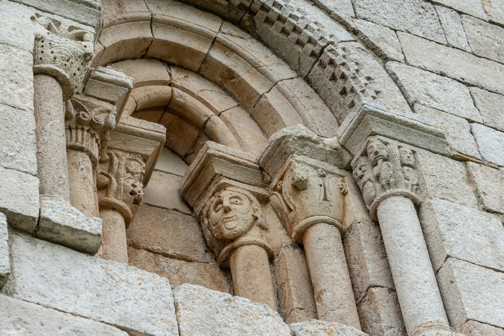 En el exterior, los capiteles figurativos representan criaturas híbridas y escenas religiosas. Pero ellos son los que llamamos «sándwiches»Figuras humanas talladas en piedra, de las que sólo se ven la cabeza y los pies, las que más intriga despiertan entre los visitantes. Nadie ha podido determinar con certeza si se trataba de prisioneros, ermitaños o figuras con una relación simbólica más profunda con el martirio.