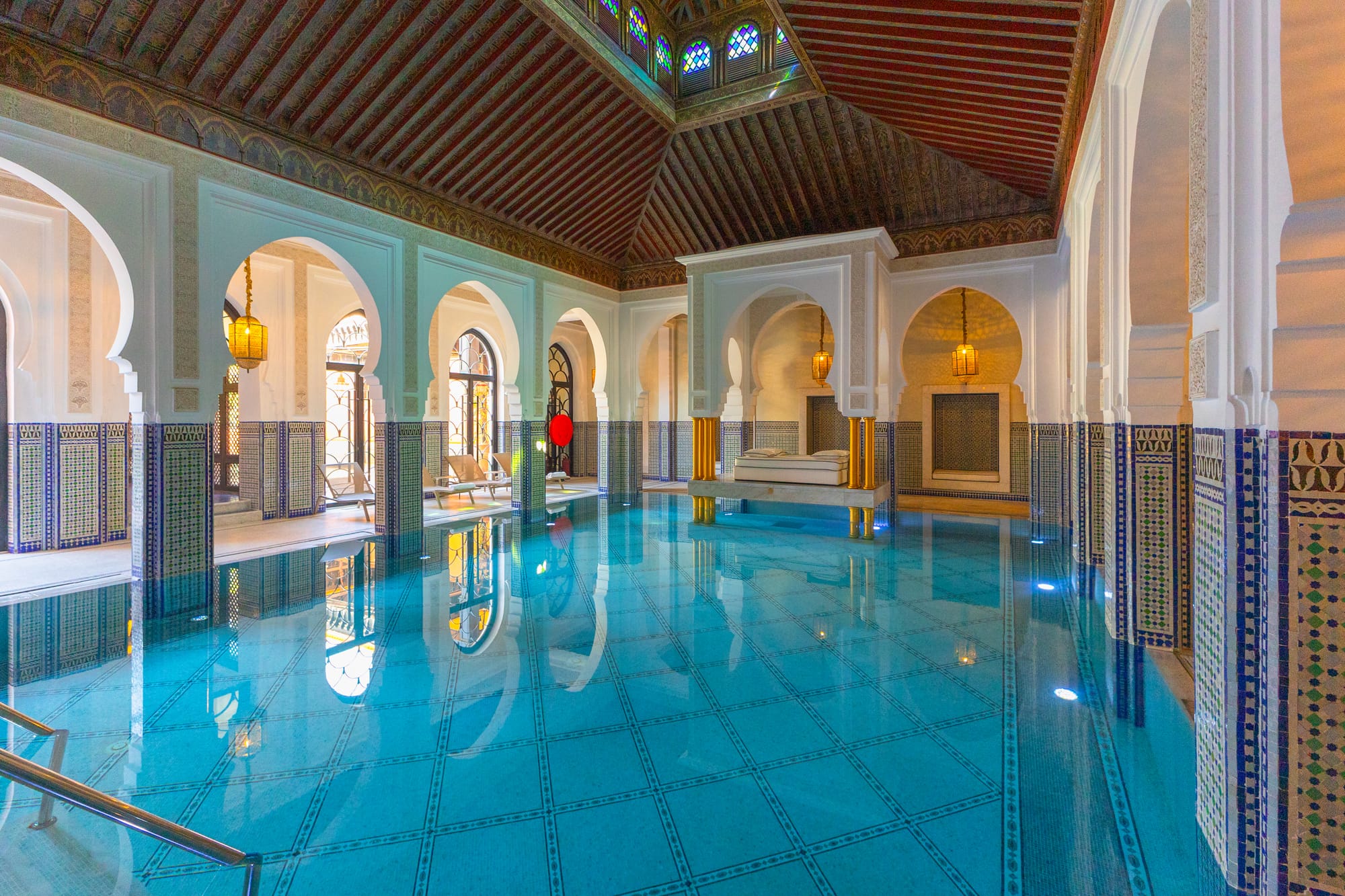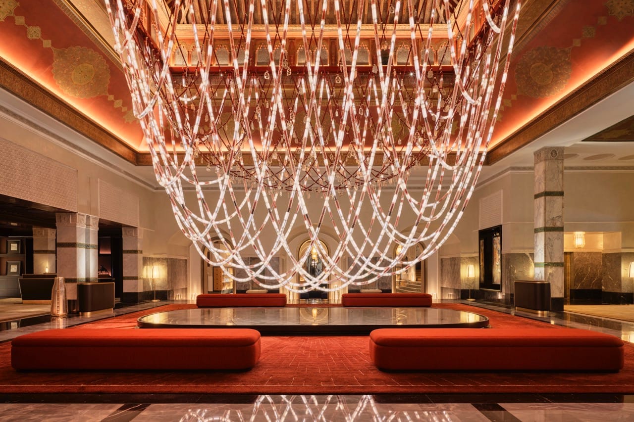 Al entrar, es imposible no ver el Lámpara Centenario. Esta obra maestra, ahora reconocida la joya de la gran damaimpone su presencia en el corazón del hotel. En un ligero homenaje a tamazightJoyería tradicional bereber, esta extraordinaria escultura luminosa evoca dos collares suspendidos en el aire. A ambos lados del corredor que conduce a Salón de té de Pierre Hermé y a SpaSeis salas transportan al visitante a un mundo lleno de misterio y exotismo a través de un viaje por la historia de Marruecos.