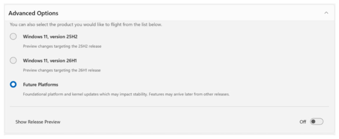 Los usuarios del programa Insider que actualmente se encuentran en el canal Canary también serán trasladados al canal Experimental, dependiendo de la versión específica asociada con su versión principal de Windows. Las dos versiones específicas son Future Platforms y 26H1, y la transición se realizará de la siguiente manera: