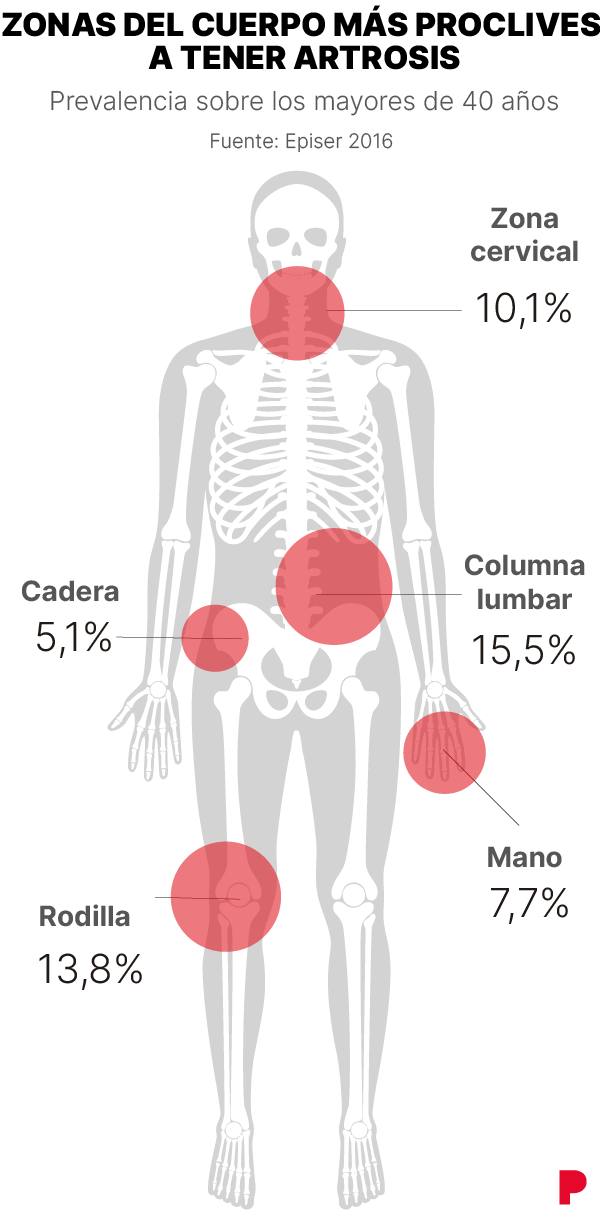 La artrosis es una de las enfermedades más prevalentes, sobre todo a partir de los 65 años, dado que afecta al 80% de los séniors. Pero cada vez hay más diagnósticos en adultos jóvenes, de entre 30 y 40 años, debido al incremento de la obesidad y de la práctica de deporte de alto impacto. Si se hiciera el ejercicio abstracto de reducir la sociedad a dos grupos, podría dividirse, hoy día, entre los que practican ejercicio con alta frecuencia, por un lado, y los que lo rehúyen y están afectados de sobrepeso, por otro. Y a ambos colectivos pueden sufrir artrosis, que es una enfermedad crónica y degenerativa que causa un desgaste progresivo del cartílago que recubre los huesos de las articulaciones y que produce dolor, rigidez y pérdida de movimiento.
