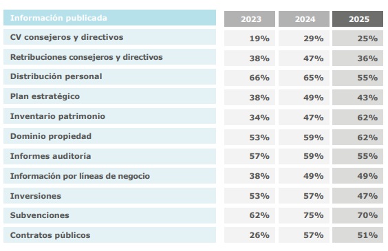 Sin embargo, en cuanto al análisis por atributos, muestra avances consolidados en la información sobre la estructura de propiedad, el inventario de activos o la desagregación por líneas de negocio. Sin embargo, en contraste con este avance, hay una disminución en la publicación de datos relacionados con la retribución de los órganos de gobierno, la distribución del personal, los informes de auditoría externa y las principales inversiones.