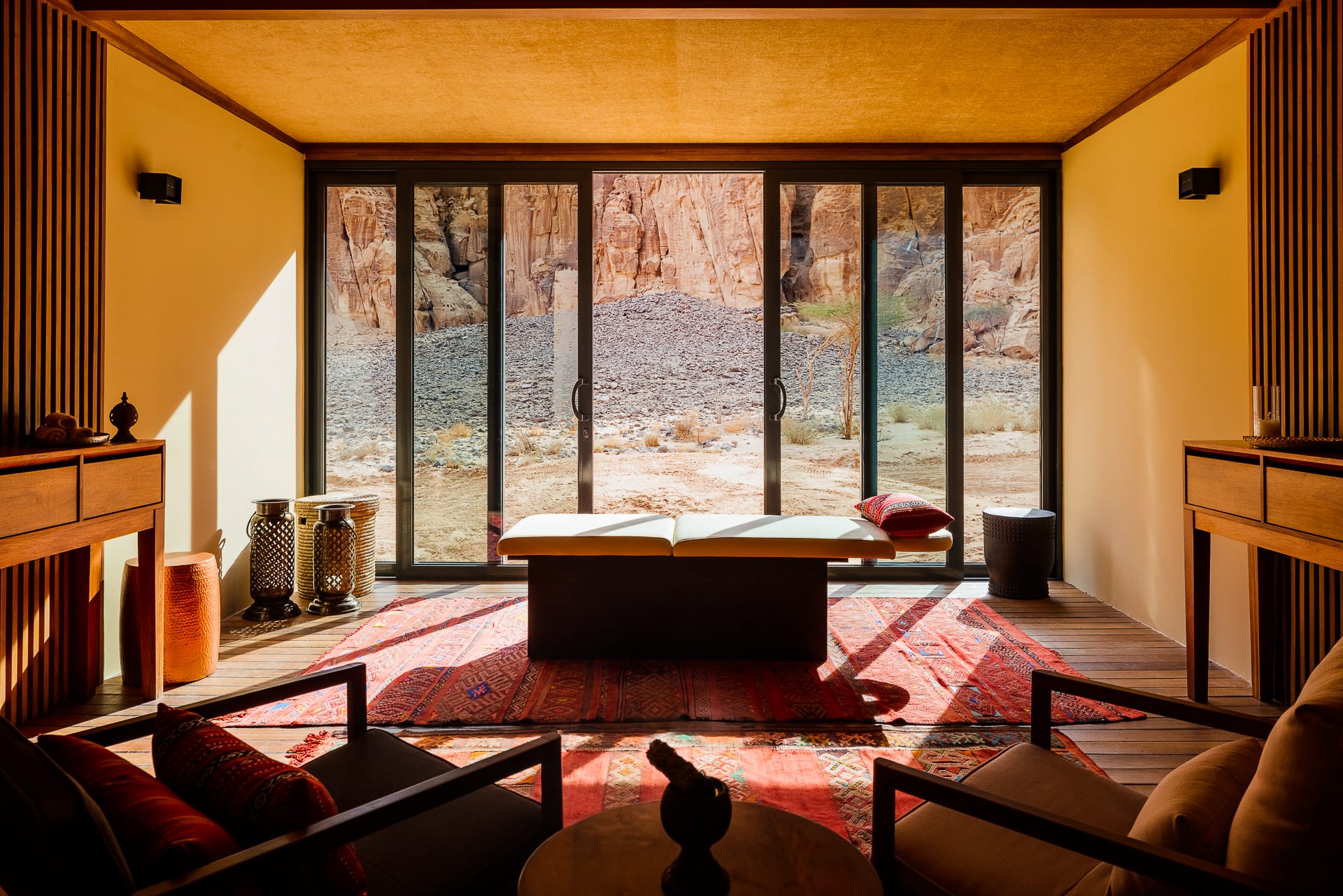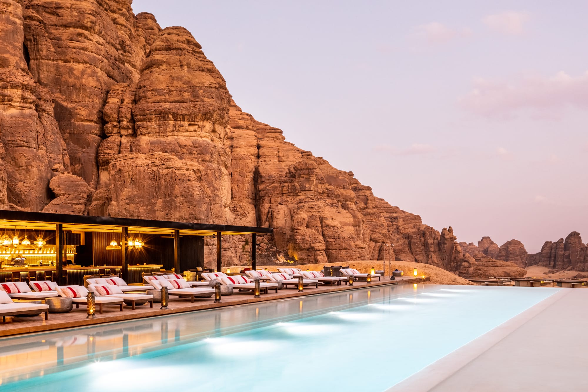 El espacio conocido como Ágora Funciona como el corazón social del resort, el punto de encuentro donde la hoguera y el cielo abierto añaden una dimensión casi ceremonial a la convivencia entre los huéspedes. EL piscina infinitacon vistas al valle Ashares otro lugar céntrico del resort, un lugar donde el agua y el paisaje de roca y arena se funden en una imagen difícil de olvidar y que se ha convertido en una de las postales más famosas de Arabia Saudita gracias o gracias a Instagram.