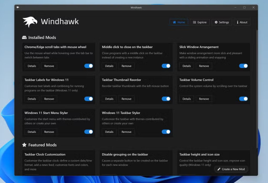 Contiene sus propios mods, pero también invita a desarrolladores externos a agregar sus mods para que puedan ser utilizados por el cliente normal, que actúa como una plataforma liviana donde puedes elegir modos individuales que se adapten perfectamente a tus necesidades. Cada mod es una pequeña pieza de código C++ que Windhawk inyecta en el proceso de Windows. También vale la pena señalar que los desarrolladores incluyeron el código fuente de todo esto en aras de la transparencia.
