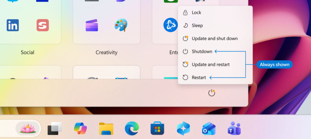 Otro cambio tiene como objetivo garantizar que los usuarios de Windows 11 siempre tengan una opción Apague o reinicie su dispositivo sin actualizar. Windows 11 distinguirá claramente entre operaciones de encendido y operaciones de actualización. El menú de encendido mostrará opciones separadas de reinicio y apagado, lo que significa que los usuarios podrán elegir entre reiniciar o apagar su dispositivo sin tener que instalar primero las actualizaciones pendientes. Además, opciones de actualización específicas como Actualizar y reiniciar y Actualizar y apagar están disponibles si el usuario lo desea. Este tipo de control sobre la instalación de actualizaciones en los peores momentos posibles, cuando más se necesita el dispositivo, también es bienvenido.