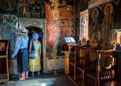 En el interior del templo, cuando la vista se acostumbra al contraste entre la luminosidad exterior y la oscuridad interior, sorprenden los frescos que cubren techos y paredes. En la cúpula, el Pantocrátor rodeado de ángeles. Abajo, evangelistas, apóstoles y profetas. Y básicamente, los fieles. Pero es en el nártex que precede a la iglesia donde se encuentran las pinturas más sorprendentes: la representación minuciosa, colorida y formidable de las torturas sufridas por los santos, desde la decapitación hasta el aplastamiento o la quema en vida.