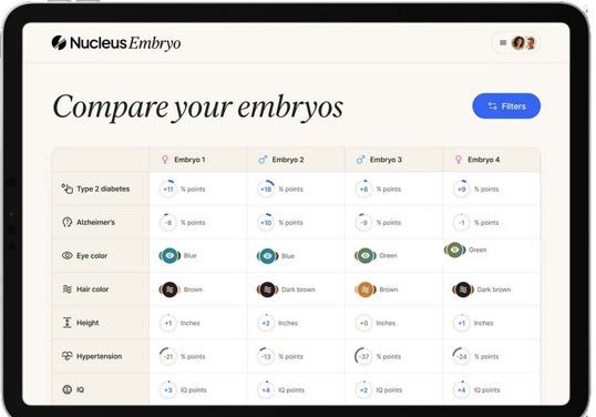 La pantalla de la tableta muestra una interfaz limpia, elegante y minimalista. debajo del encabezado “Compara tus embriones”Cuatro columnas muestran el futuro de una familia como si fuera la configuración de un personaje de un videojuego de rol o el comparativo … modelos de autos gama alta. No hay rastro de la complejidad ética de la genética; Sólo iconos y porcentajes. En la aplicación de la empresa estadounidense Nucleus Genomics, el cliente observa a sus hijos potenciales.